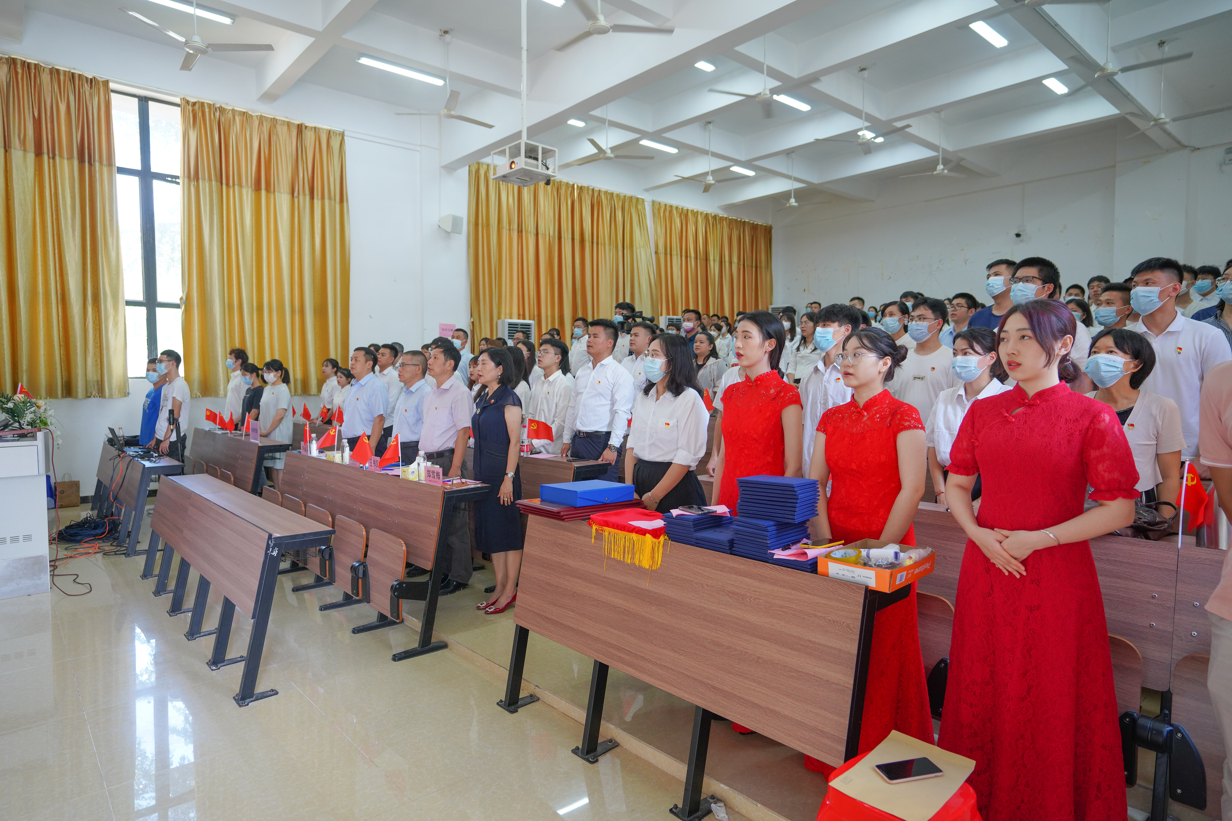 大会在庄严的国歌声中拉开帷幕。行政三党支部书记、学生发展部部长刘奇志同志带领预备党员宣誓、老党员重温入党誓词。