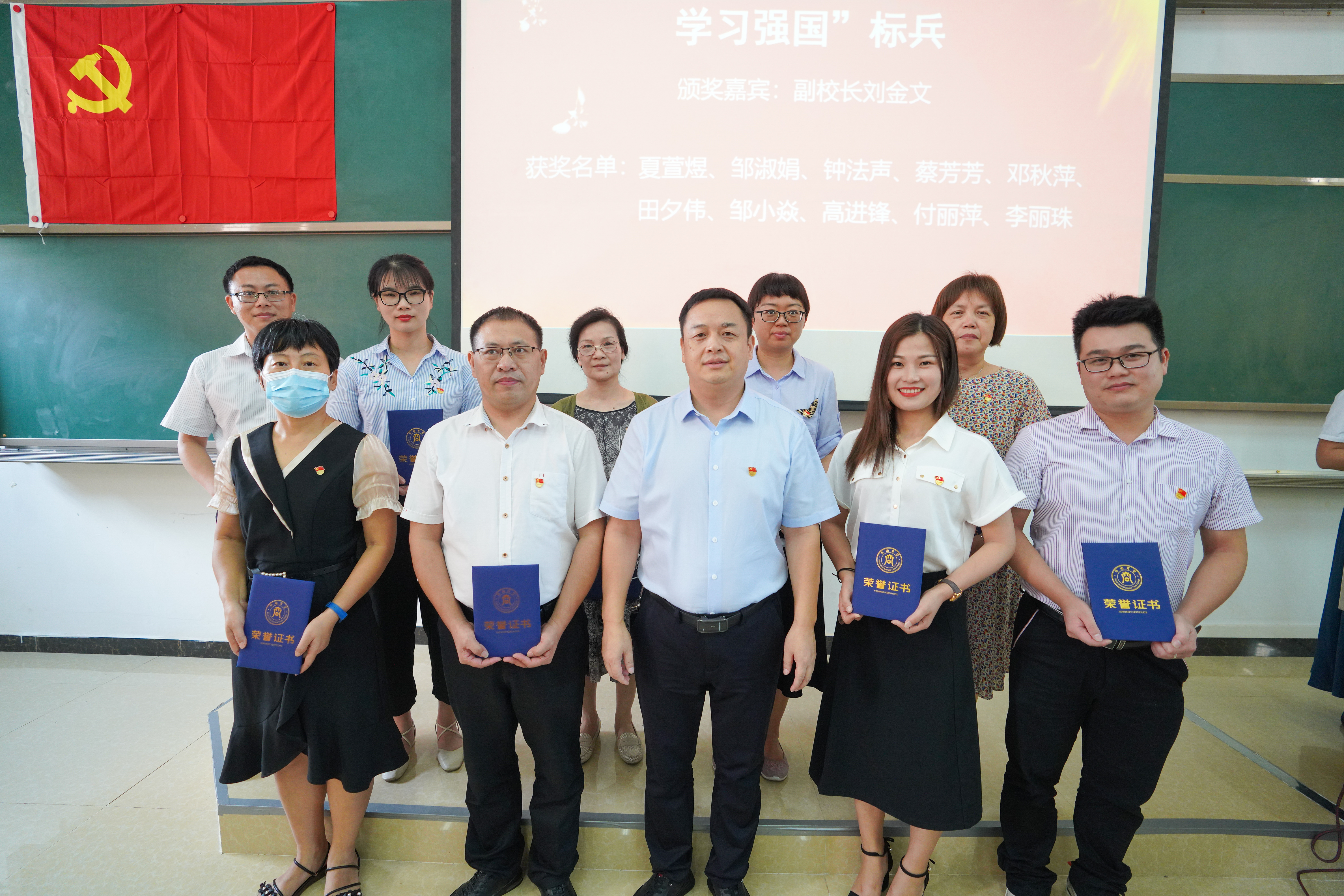 副校长刘金文为田夕伟等10名“学习强国”学习标兵颁奖,他们带头学习、追赶比超,树立榜样。