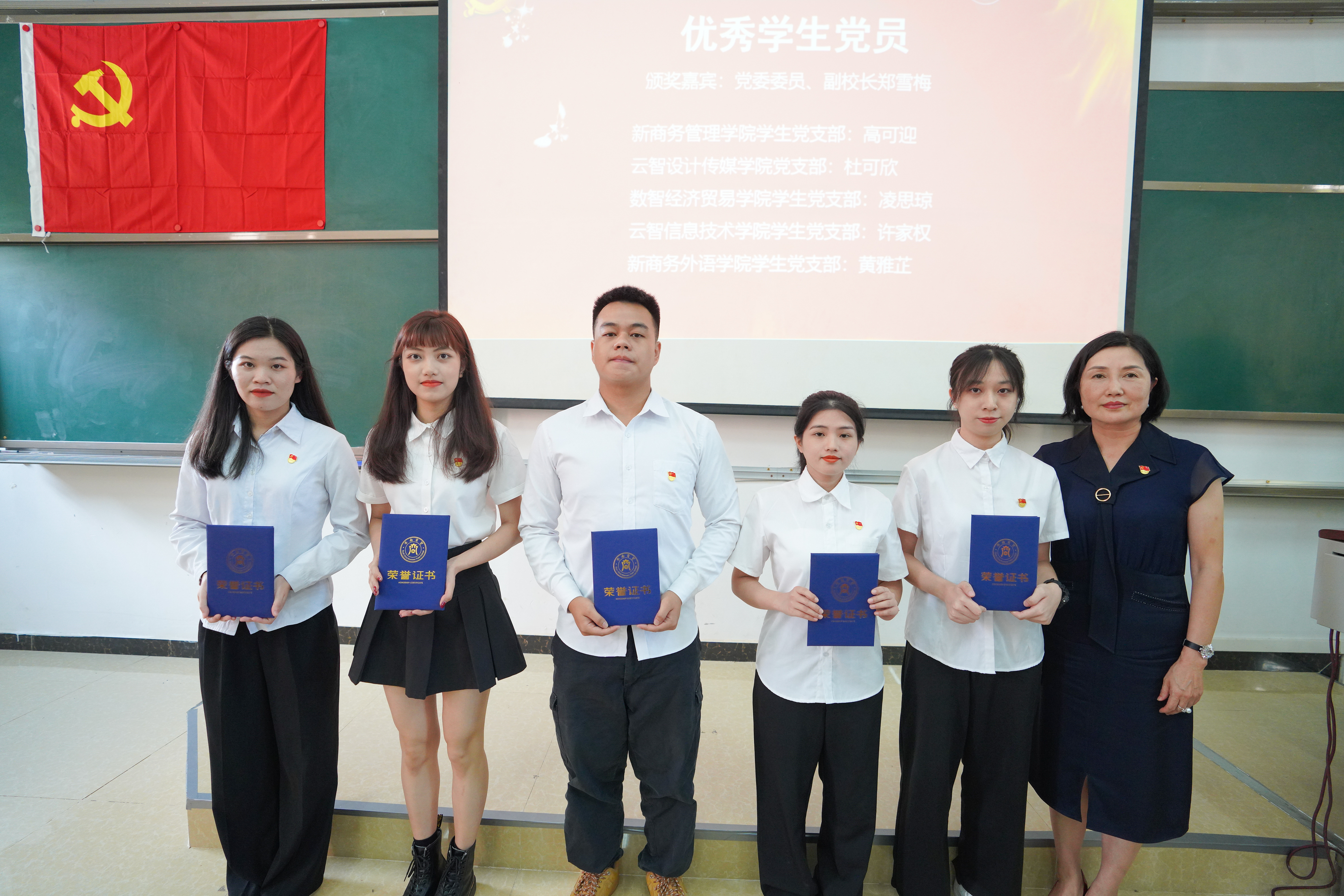 党委委员、副校长郑雪梅为许家权等5名优秀学生党员颁奖,他们严格要求自己、努力学习,在学生中充分发挥带头模范作用。