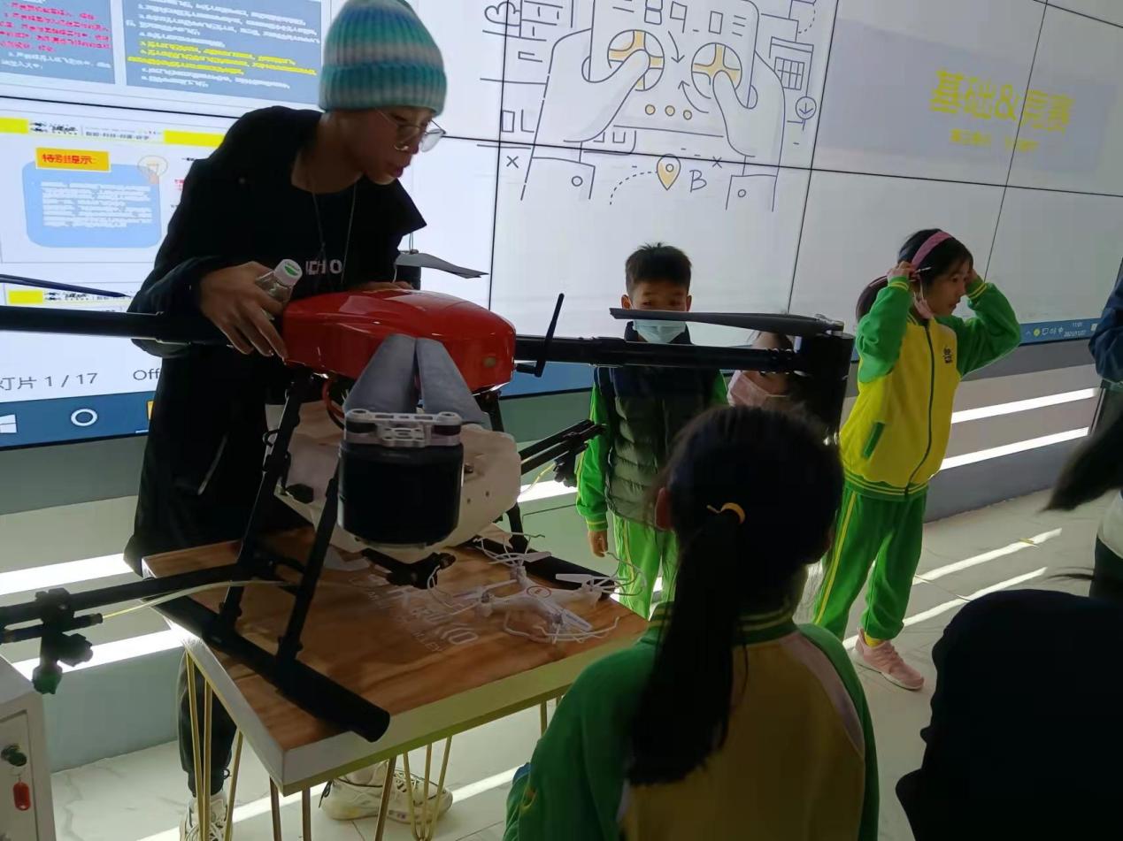 随后,王锦豪同学向孩子们普及农用无人机的应用知识。农业无人机用于农林植物保护作业,通过地面遥控或GPS飞控,实现喷洒药剂、种子、粉剂等田间作业,其喷洒效率是传统人工的30倍。孩子们听得津津有味,不时为我国科技的快速发展而感慨。