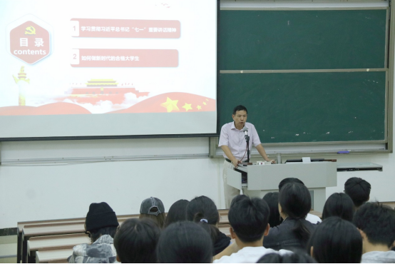 10月12日晚上,王书汉书记在教学楼3-103上思政第一课,云智设计传媒学院2020级学生及新生代表共150余人到场听课。课上,王书记带同学再次学习回顾了习近平总书记在庆祝中国共产党成立100周年大会的重要讲话。