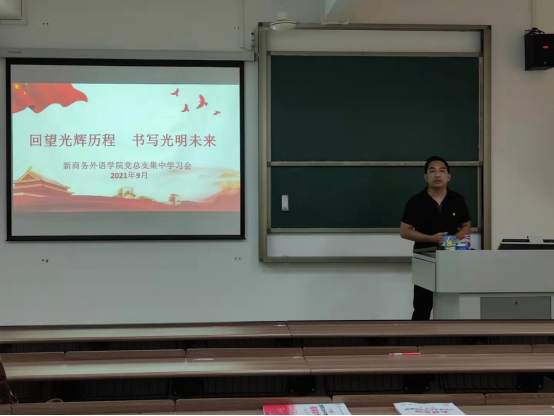 为进一步学习习近平总书记在庆祝中国共产党成立100周年大会上的重要讲话精神,推动我院党史学习教育走深走实,9月29日下午2点,新商务外语学院党总支在教学楼1-309教室召开集中学习会。本次会议由新商务外语学院党总支书记蔡天奎主持,新商务外语学院党总支全体党员参加会议。