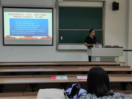 首先,蔡天奎书记以《回顾光辉历程,书写光明未来》为主题,带领各位党员一起以习总书记七一重要讲话为切入点,回顾了百年建党史,我们党从嘉兴的红船出发,为了实现中华民族伟大复兴,团结带领中国人民,浴血奋战,创造了前往古人的伟大成就。世界百年未有之大变局,中国正逐步走向世界舞台的中心,实现中华民族的伟大复兴进入了不可逆转的历史进程。深入学习党史,以史为鉴,做到明理、增信、崇德、力行,在新的征程上牢记初心使命,为党育人,为国育才。