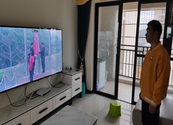 “起来!不愿做奴隶的人们! 把我们的血肉,筑成我们新的长城! ......” 伴随着雄壮的国歌声,五星红旗冉冉升起。屏幕前,党员们行注目礼,唱响国歌。即使只有一台电脑、一部手机,但当国歌响起的时候,党员们依然饱含深情,心潮澎湃。