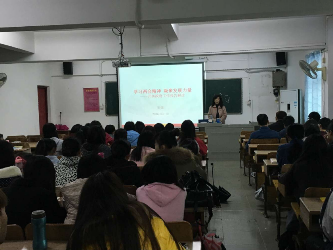 宋书记讲课的主题为《学习两会精神 凝聚发展力量——2016政府工作报告解读》,她从“两会”的基本知识及2016年“两会”的十大热点、政府工作报告热词等三个方面作了精彩的讲解,深刻阐述“两会”的重大意义、李克强总理在2016年政府工作报告中展示的2015年的成绩、“十三五”时期主要目标任务和重大举措,并对报告中“工匠精神、供给侧结构性改革、大众旅游时代、分享经济”等热词、新词作了详细的解读。宋书记结合高职院学生的特点,强调在新常态下高职院学生要有敬业精神、有创业胆识和知识储备。