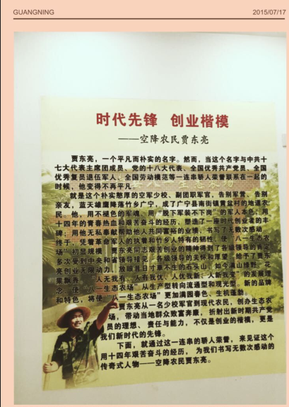 在这个骄阳似火的七月,我院大学生党员社会实践服务队选择了具有典型教育意义的广宁八一农场作为创业体验基地,近距离观摩、了解十七大、十八大代表主席团成员、全国劳模、全国优秀共产党员、全国优秀复员退伍军人、全军英模代表、全国“三农”十大致富榜样、改革开放30周年感动广东人物贾东亮同志创业经历。我们走访了当地村民,倾听他们对“空降农民”的评价。