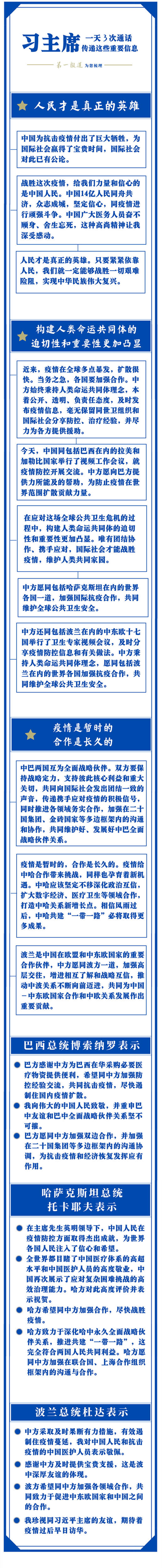 频密互动,高效沟通。习主席通话内容信息量很大:介绍中国抗疫努力,深化国际抗疫合作,推动双边关系发展……其中,“合作”与“人类命运共同体”是习主席反复提到的关键词。